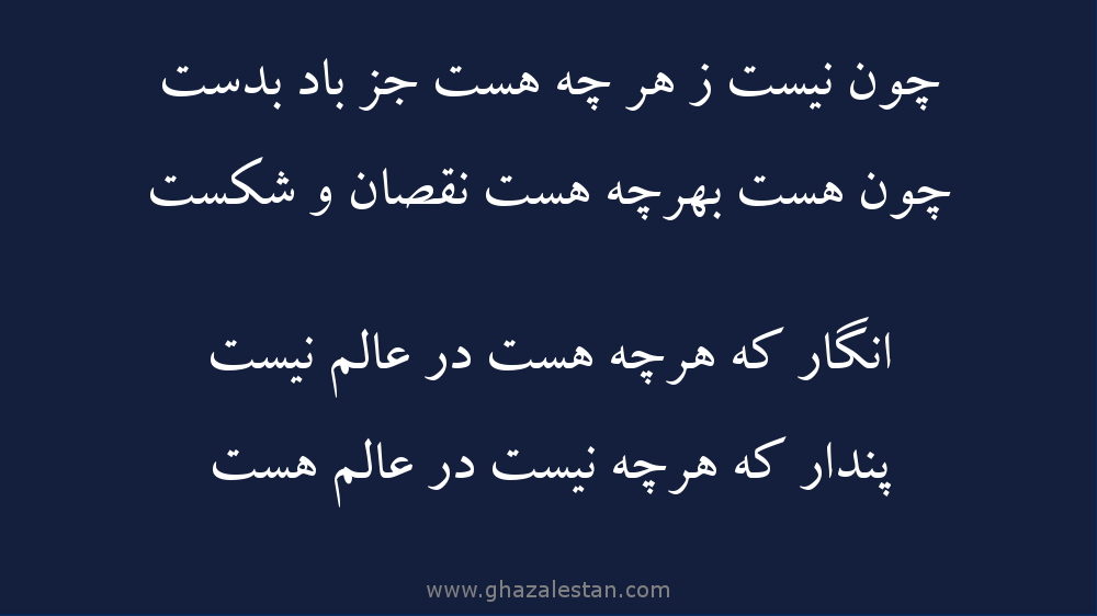 این ابیات دقیقا مفاهیمی رو بیان میکنه که الان خیلی مطرحه و اینکه این دنیا و چیزهایی که ما به ظاهر اونا رو واقعی میدونیم و خواهان بدست آوردنشون هستیم ، جز خیال موهومی بیش نیستند و حتی اگه اون خیالات موهوم رو چندی داشته باشی مثل باد که تو دستانت نمیتونی نگهش داری پایدار نیستند ، و این جهان ، جهان کمبود و شکسته ، حهانیه که باید خیلی از این کمبودها و شکست ها ما رو رشد بده ،