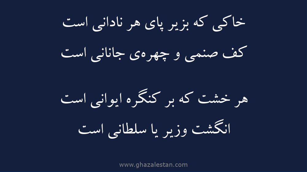 خاکی که بزیر پای هر نادانیست کف صنمی و چهره ی جانانیست هر خشت که بر کنگرهی ایوانیست انگشت وزیری و سر سلطانیست