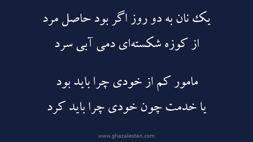از سرو بلند سایه داری مطلب از مردم این زمانه یاری مطلب عزت به غناعت است و خواری به طمع با عزت خود بساز و خواری مطلب