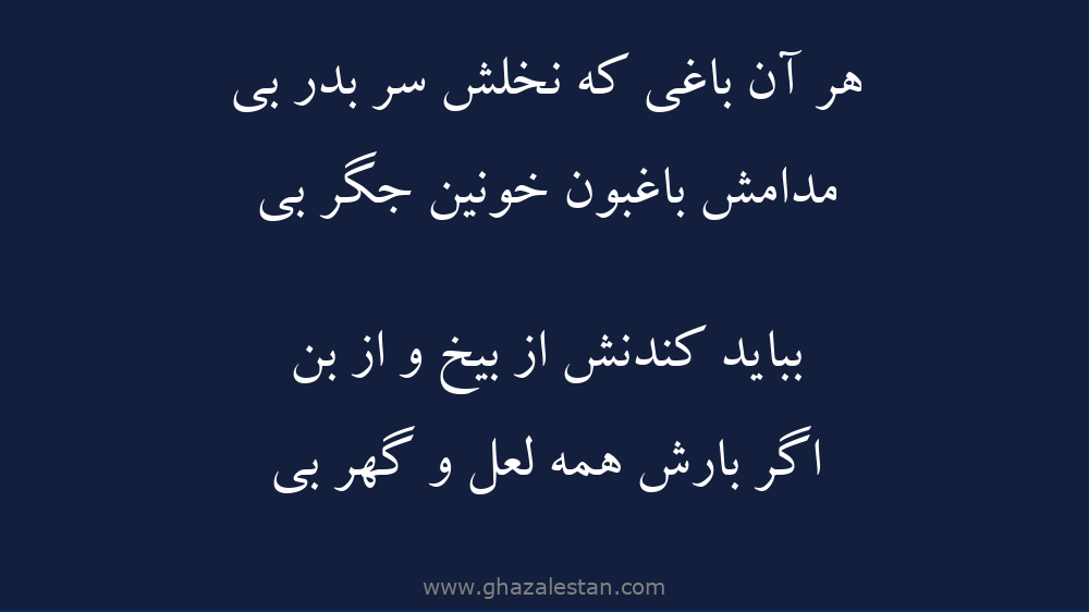 هر آن باغی که نخلش سر به در بی ؛ کنایه از نخل بسیار بلنده که باغبون هر سال برای بارور کردنش خیلی اذیت میشه و زجر میشکه چون نخل از وقتیکه میوه دادنش شروع میشه چندین بار باغبون باید بره بالای نخل و تنظیمش کنه ، باباطاهر میگه این نخل رو باید از بیخ و بن بکنیش حتی اگه بارش لعل و گوهر باشه