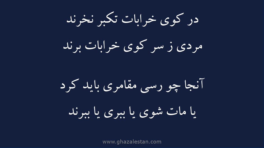 اگر به منزل معرفتی خرابات که فارق از تمام آنچه بودی وهستی رسیدی ،از تکبر وغرور خالی باش چون در آن منزل ،خریداری ندارد،ومردانگی وانسانیت ،ره توشه ای است که می توانی از این منزل دریافت کنی ،اما بدان که رسیدن به این منزل خود قماریست بزرگ ،که ممکن تورا به بهت وحیرت وواماندگی برساند ویانه تو بالاترین بهره را ببری وآدمی خودساخته وطریق شناس شوی ویا ابعاد وجودی این منزل تورا برای همیشه مجذوب خود کند وتارک دنیا شوی ،این قمار بزرگیست.